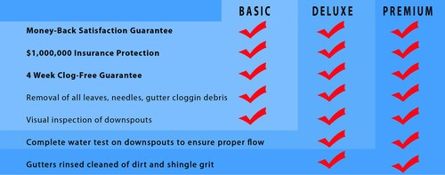 The chart below explains all the different gutter cleaning packages that we offer. All gutter cleaning comes with our 100% Money-Back Satisfaction Guarantee and a 4 Week Clog-Free Guarantee. Prices start at only $129.