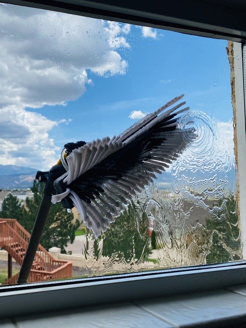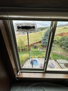 We use water-fed poles systems to clean hard to get to outside windows. We first run tap water through our de-ionization filter to remove all the minerals and impurities. That water is then sent up a small hose though a pole and out the middle of a brush. We use that brush to thoroughly scrub the window, breaking up the bond of the dirt to the glass, and then the purified water is used to rinse away all of the remaining dirty water. The glass then air dries and what is left is a completely clear, spot free window.
