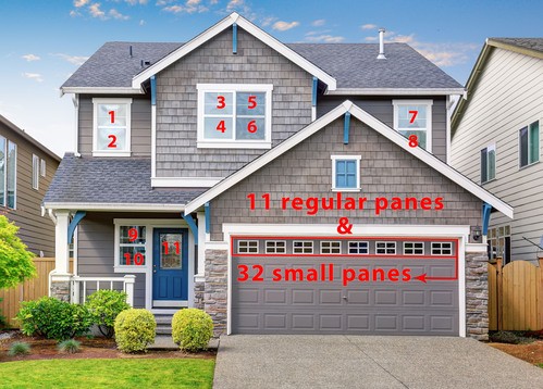 We have two options for bids: a rough bid that uses an average number of window panes for your size house and an exact bid that uses the actual number of window panes that you provide. If you are going to use the exact bid option, we recommend that you walk around the outside of your house to count the window panes. A window pane is each piece of glass that is surrounded by a frame. The typical slider window has two panes- one slides in front of the other to open. Here is a example of how to count window panes: